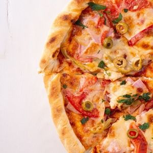 Molho de tomate especial, queijo mussarela, presunto, cebolas, azeitona e orégano.