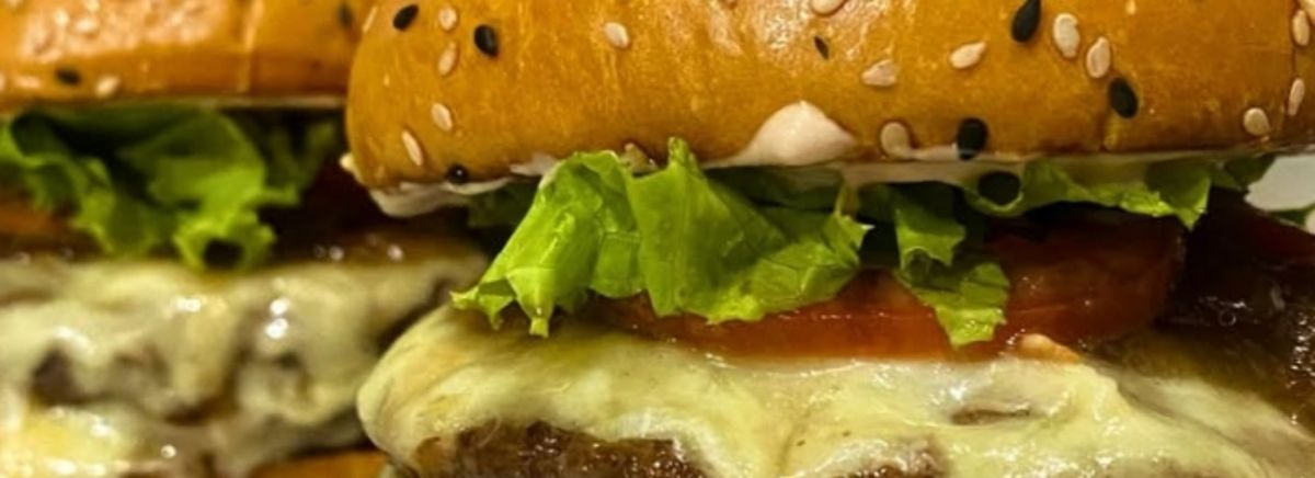 Pão brioche, 2 hambúrguer industrial, cheddar, alface, cebola, tomate, maionese da casa.