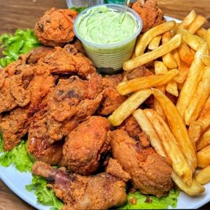 Acompanha porção de batata frita, Arroz, feijão macassar, farofa e vinagrete.