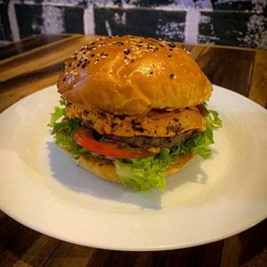 Pão brioche,2 carne 120g, cebola caramelizada,molho da casa e salada