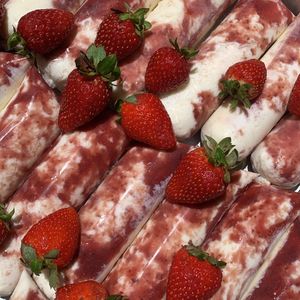 Um maravilhoso sacolé super cremoso de ninho com geleia de morango.