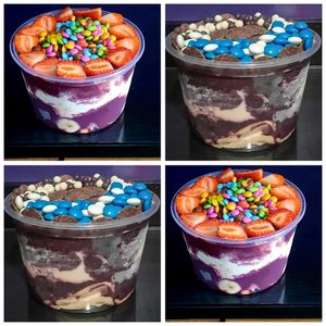 Quatro potes de açaí de 550ml cada, com quatro adicionais montados em camadas dentro dos potes.