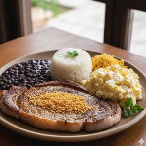 Ancho Suíno com alho torrado e salada de batata e ovos, com arroz, feijão e farofa