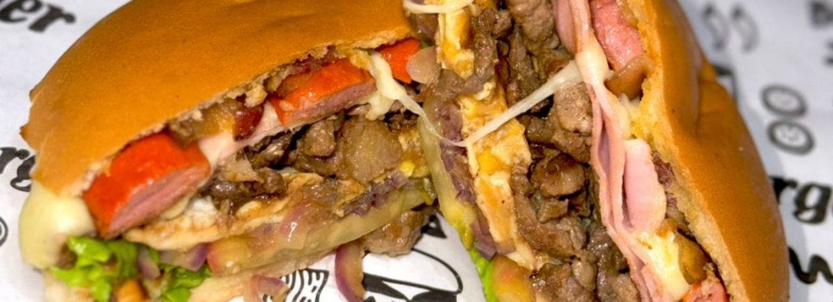 Pão, alface, tomate, ovo, hambúrguer artesanal, presunto, mussarela, salsicha e bacon.