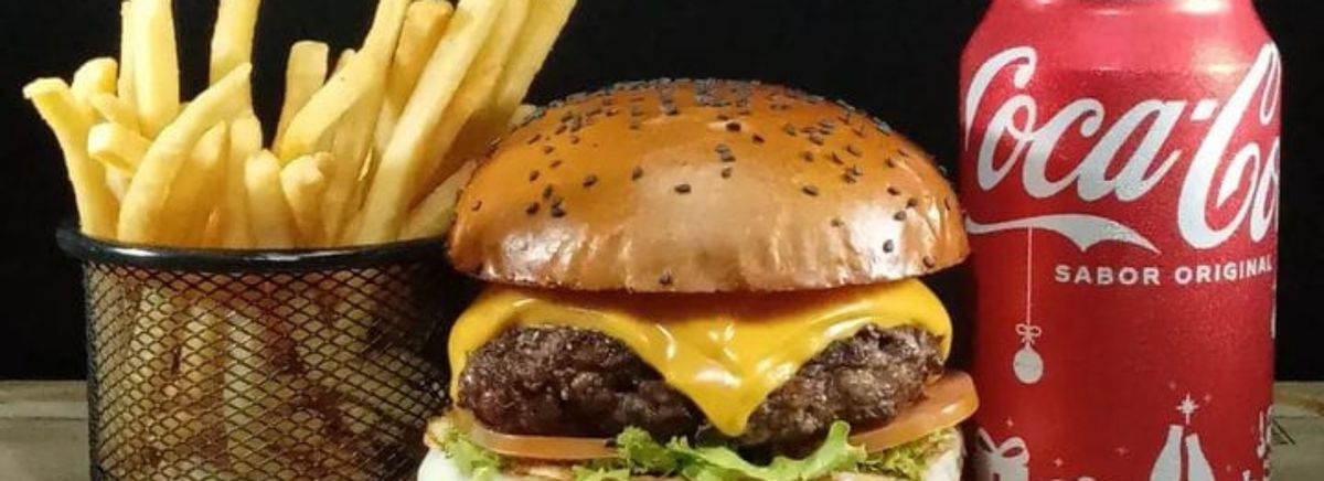 Pão american bread, hambúrguer tradicional, ovo, presunto, queijo mussarela, salsicha e salada, acompanhar fritas e refrigerante lata.