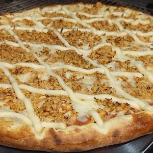 Frango desfiado, queijo mussarela, presunto e orégano.
