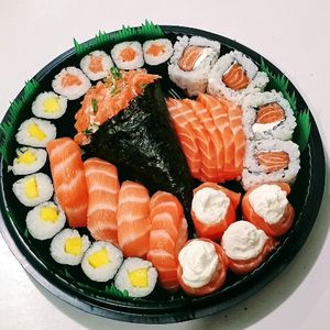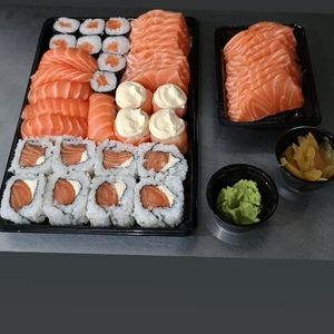 2 Temak salmão, 10 hot holls, 8 urumaki salmão, 8 hossomk salmão, 10 sashimis, 6 niguiri salmão, 4 Joe salmão