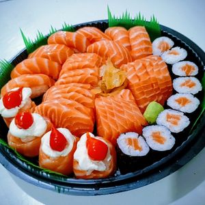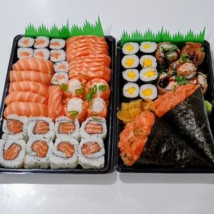 8 urumaki Califórnia, 8 hossomk salmão, 8 hossomk kani, 8 hossomk pepino,8 urumaki salmão,10 sashimis fresco,6 niguiri salmão, 6 niguiri skin 4 joe salmão,6 niguiri salmão fresco