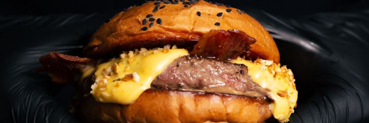 Pão brioche chapeado com manteiga, maionese umami, blend de carne bovina com 160g, 2 fatias de bacon, picles, creme artesanal de cheddar e farofa Umami