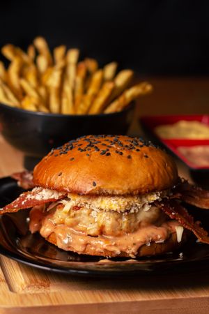 Pão brioche chapeado na manteiga, molho rose da casa, hambúrguer artesanal de frango 150g. , queijo provolone defumado, creme artesanal de cheddar, 2 fatias de bacon crispy e farofa Umami + Batata Frita
