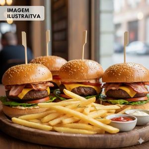 Bife de 150g alface tomate picles maionese barbecue 125g de batata