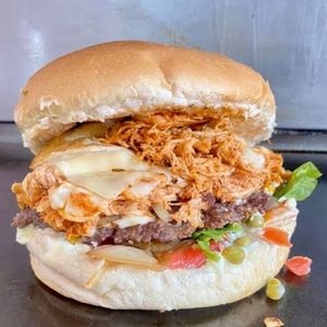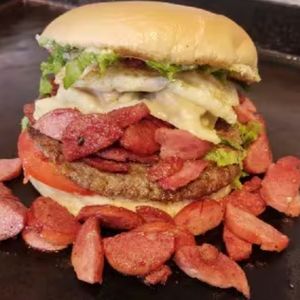 Pão, maionese, alface, tomate, milho, ovo, queijo, bife artesanal e coração.