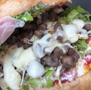 Pão, maionese, tomate, milho, alface, queijo, ovo, calabresa e coração frito na chapa.