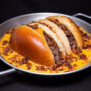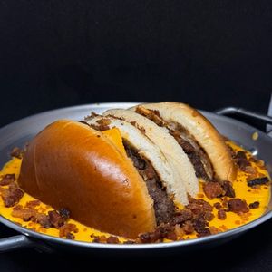Hambúrguer artesanal de 120g de costela no ponto perfeito, servido no pão brioche premium, cortado no meio e mergulhado numa generosa piscina de cheddar cremoso. Finalizado com farofa crocante de bacon. Uma explosão de sabor para quem ama queijo e quer sair da rotina!
