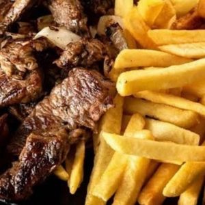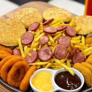 140g contrafilé acebolado, 140g isca de frango, calabresa fatiada, Batata média , 1 Queijo coalho, Sugestão para 2 pessoas.