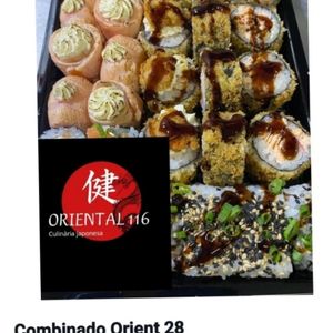 32 peças 4 uramaki salmão 8 hossmáki salmão 5 hot holl 3 niguiri salmão 4 Joe salmão crem chessen 4 uramaki de kani 4 sashimis Complementos :couve grelhada, geleia de pimenta, cebolinha, crem chessen.