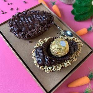 Contém 9 mini ovos recheados de ninho e brigadeiro