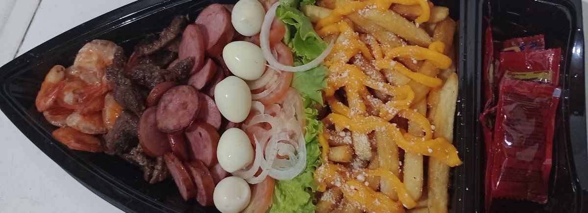 Acompanha 300g de batata frita, 400g de carne com calabresa, 10 mini coxinhas, 4 pastéis médios (8cm), 5 ovos de codorna, com molho, cheddar e queijo ralado.