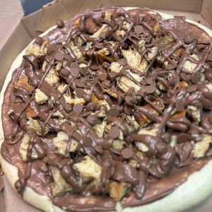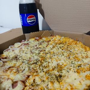Pizza grande com 8 fatias, borda grátis e acompanha 1 refrigerante de 1L (Pepsi ou Guaraná).