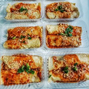 Massa artesanal de Panqueca com carne moída, molho artesanal de tomate e queijo muçarela ralado
