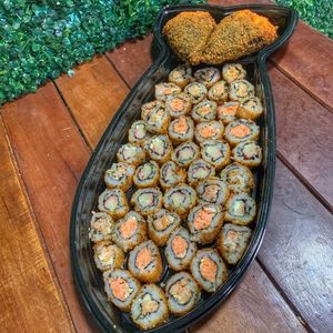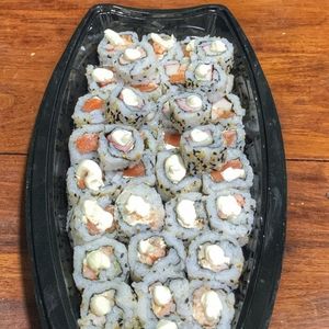 Salmão, camarão, Kani, cream cheese, cebolinha e arroz.