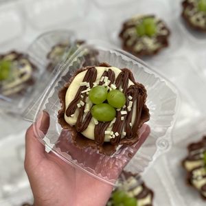 Cestinha banhada no chocolate blend, recheada com brigadeiro branco, uva verdes sem semente e Nutella 350G. Porção individual