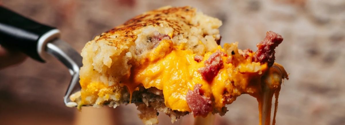 Purê de batata gratinado, carne moida(acem), mussarela, requeijão cremoso e batata palha.