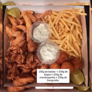 500g de batata com chaddar e bacon, 300g de filé de tilápia ,e 300g de camarão empanado. Acompanha limão e maionese caseira 😁