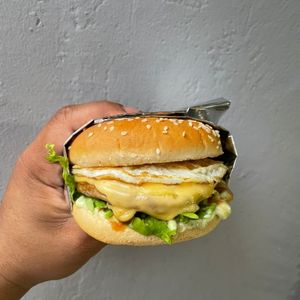 pão com gergelim, hambúrguer 56g, queijo prato derretido, ovo, alface cortado, tomate em rodelas, ketchup e maionese temperada.