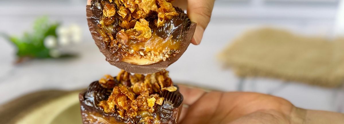 A tradicional massa de chocotone, fofinha, leve e úmida, com gotas de chocolate nobre meio amargo, recheado com a mistura perfeita do caramelo salgado, brigadeiro meio amargo e amendoim triturado. Finalizado com cobertura de chocolate meio amargo e amendoim