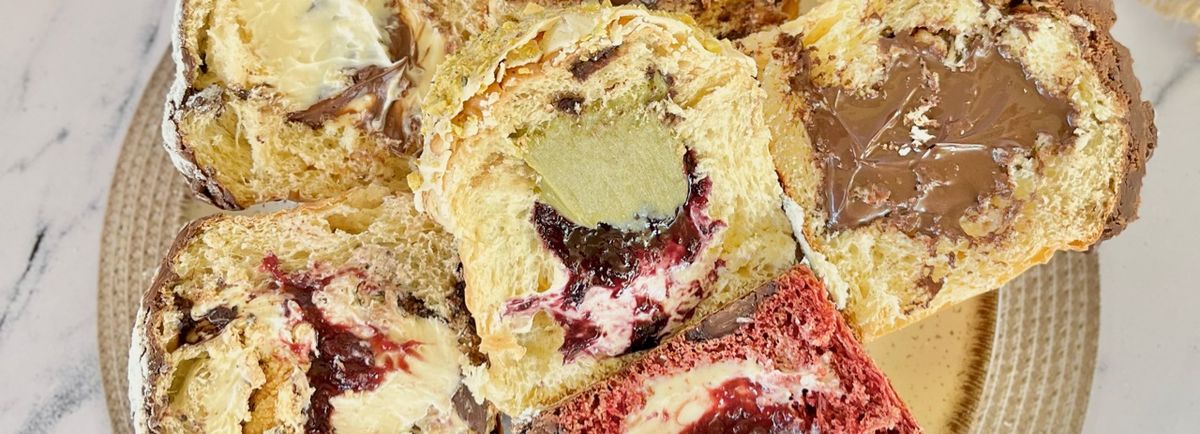 A tradicional massa de chocotone, fofinha, leve e úmida, com gotas de chocolate nobre meio amargo. Recheado com mousse de ninho, brigadeiro de pistache e geleia de frutas vermelhas. Finalizado com cobertura de chocolate branco e pistache triturado.