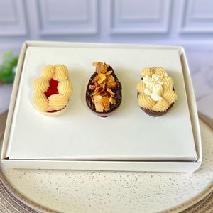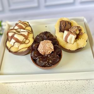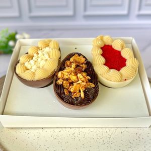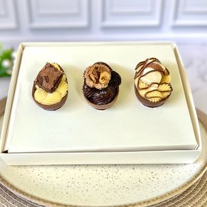 Kit composto por 3 chocotones trufados pequenos (aprox. 160g cada). - 1 Chocotone trufado Pistache com frutas vermelhas - 1 Chocotone trufado Red velvet; - 1 Chocotone trufado Crunch. Acompanha embalagem presenteável.