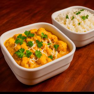Cremosa moqueca de peixe com camarões, acompanha arroz de coco.