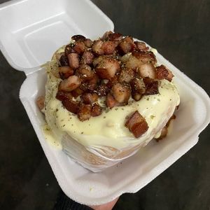 500g de batata, calabresa e bacon, orégano Cheddar e catupiry, KAtchup e molho verde, mussarela ralada. Obs: TODOS OS MOLHOS VÃO NA BATATA NÃO ENVIAMOS SEPARADAMENTE.