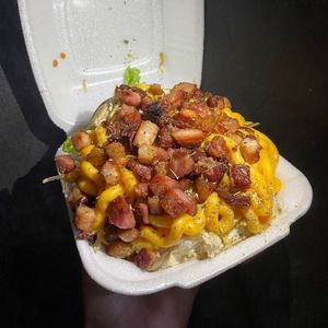 Batata frita com calabresa/bacon/camarão e carne desfiada Molhos: molho verde, catupiry, cheddar e katchup. Todos os molhos vão diretamente na batata! Finalizando com mussarela, orégano e alho frito.