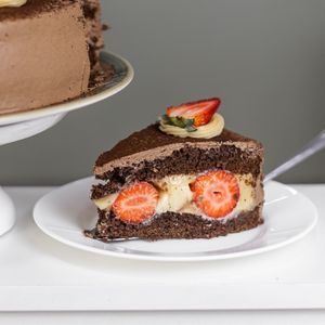 Massa de bolo 50% cacau - recheio de chocolate belga cremoso e finalizado com granulé;