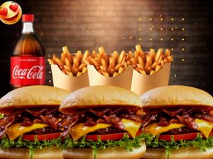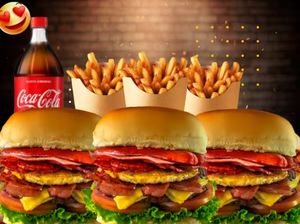 3 Burger Bacon artesanal+450g fritas+Coca 2lt
