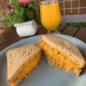 Massa com base de ovo e tapioca, recheio de frango light. Colocamos salada somente com pedido do cliente
