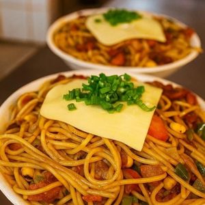 Espaguete, bacon, calabresa, tomate, milho, mussarela, cebola, pimentão, molho shoyu.