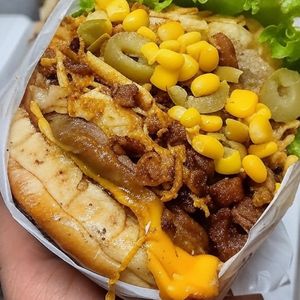 Pão com carne de hambúrguer sabor (Picanha), bacon, ovo, queijo, presunto, frango desfiado, catupiry (original),batata palha, alface, tomate, milho e azeitona.