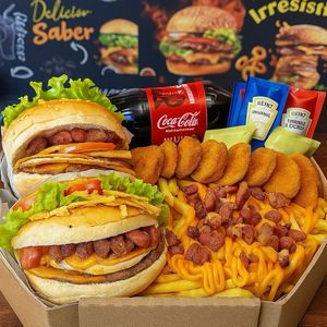 2- x burguer 400g Fritas com bacon e cheddar 10 unidades Nuggets 1 coca cola 600 ml