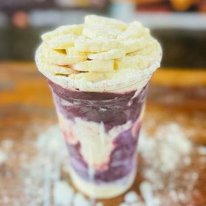 Delicioso creme de açai premium acompanha banana (prata), leite em pó e leite condensado. OBS: Acompanhamentos já vão montados no açai.