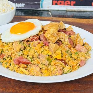 Acompanha: arroz, tropeiro, linguiça, ovo frito, bife de lombo, torresmo, couve desfiada e cebolinha.