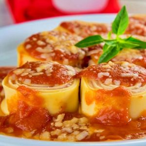Acompanha: arroz , feijão, 6 rondelli com presunto e queijo ao molho sugo , salada.