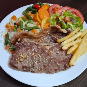 Acompanhamento arroz, feijão, farofa, salada, uma carne de contra- filé na chapa com linguiça toscana acebolada,
