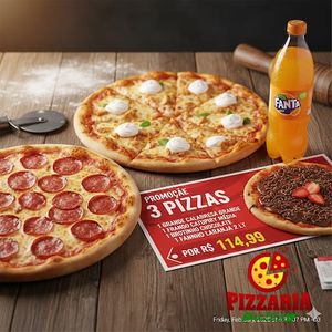 1 pizza Grande calabresa acebolada 8 fatias 1 pizza média Frango com catupiry 6 fatias 1 Brotinho de chocolate 4 fatias 1 fanta laranja ou uva 2 lt