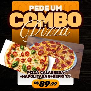 Nessa promoção você leva uma pizza grande calabresa acebolada+ uma grande napolitana+ kuat 1.5 LT