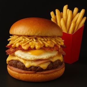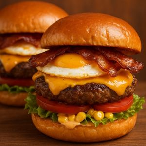 Pão , 2 carne de hambúrguer de boi ,2 ovos,bacon,cheddar,milho,alface tomate,batata palha e molho especial.