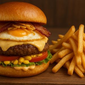 Pão , hambúrguer de boi, ovo,bacon,cheddar , batata palha,alface tomate,milho e molho especial.