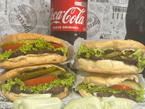 4xs, pão,hambúrguer 150g, queijo,presunto,alface,tomate,pepino,milho,ervilha e maionese caseira e uma coca 2l
